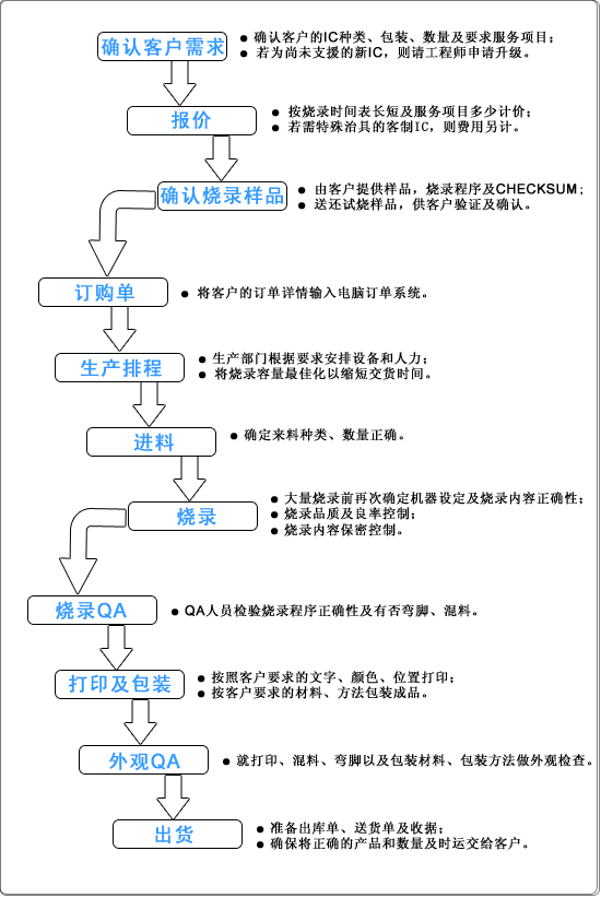工廠采用DATA I/O,MINATO,ELNEC,景天,西爾特,周立功,碩飛等國(guó)內(nèi)外先進(jìn)的手動(dòng)/自動(dòng)燒錄設(shè)備,ISO管理模式,恒溫恒濕設(shè)備, 全空調(diào)作業(yè),為你的IC燒錄良品率提供可靠的保障。彈性的配合,可以隨時(shí)派駐廠燒錄。